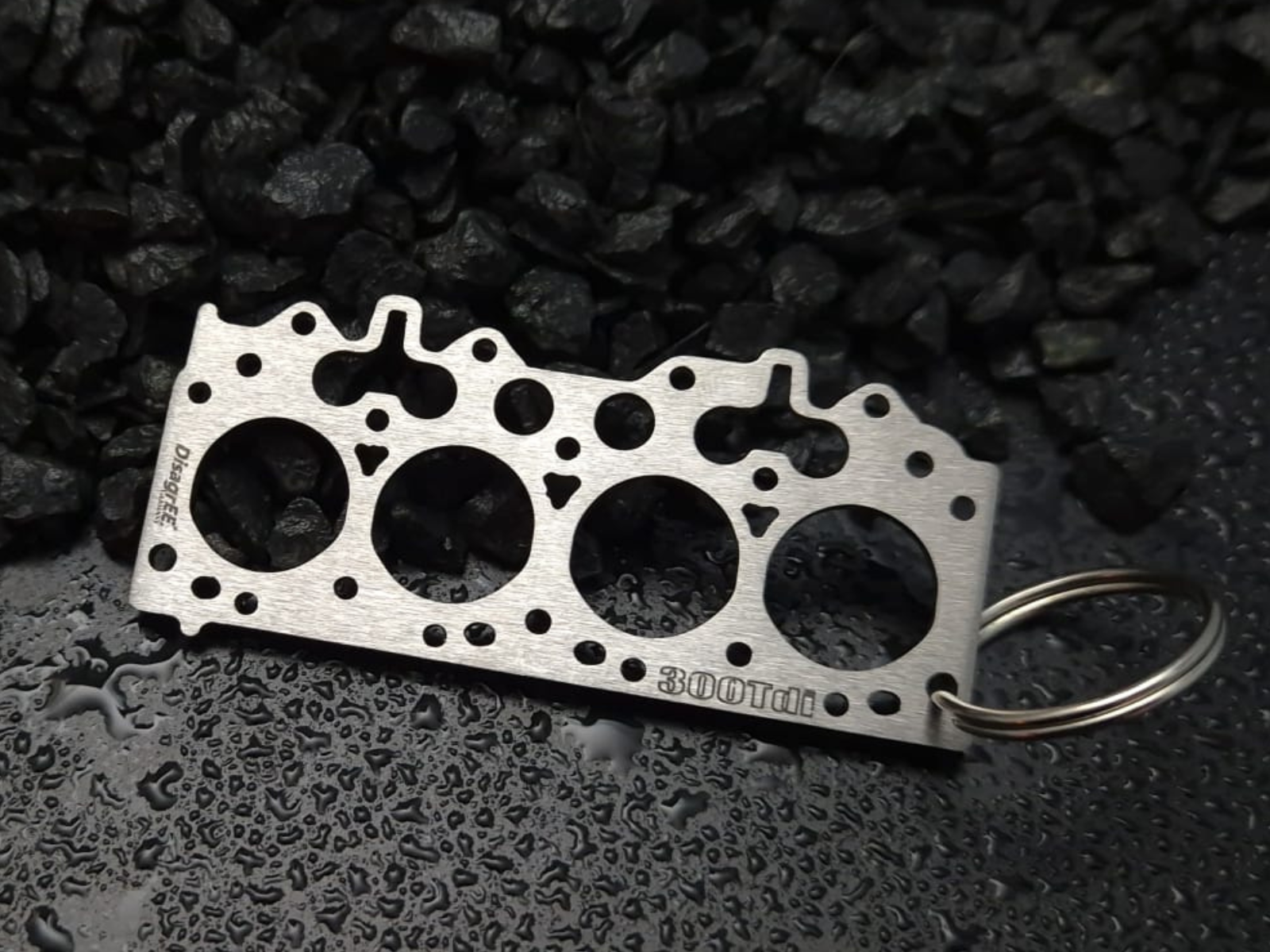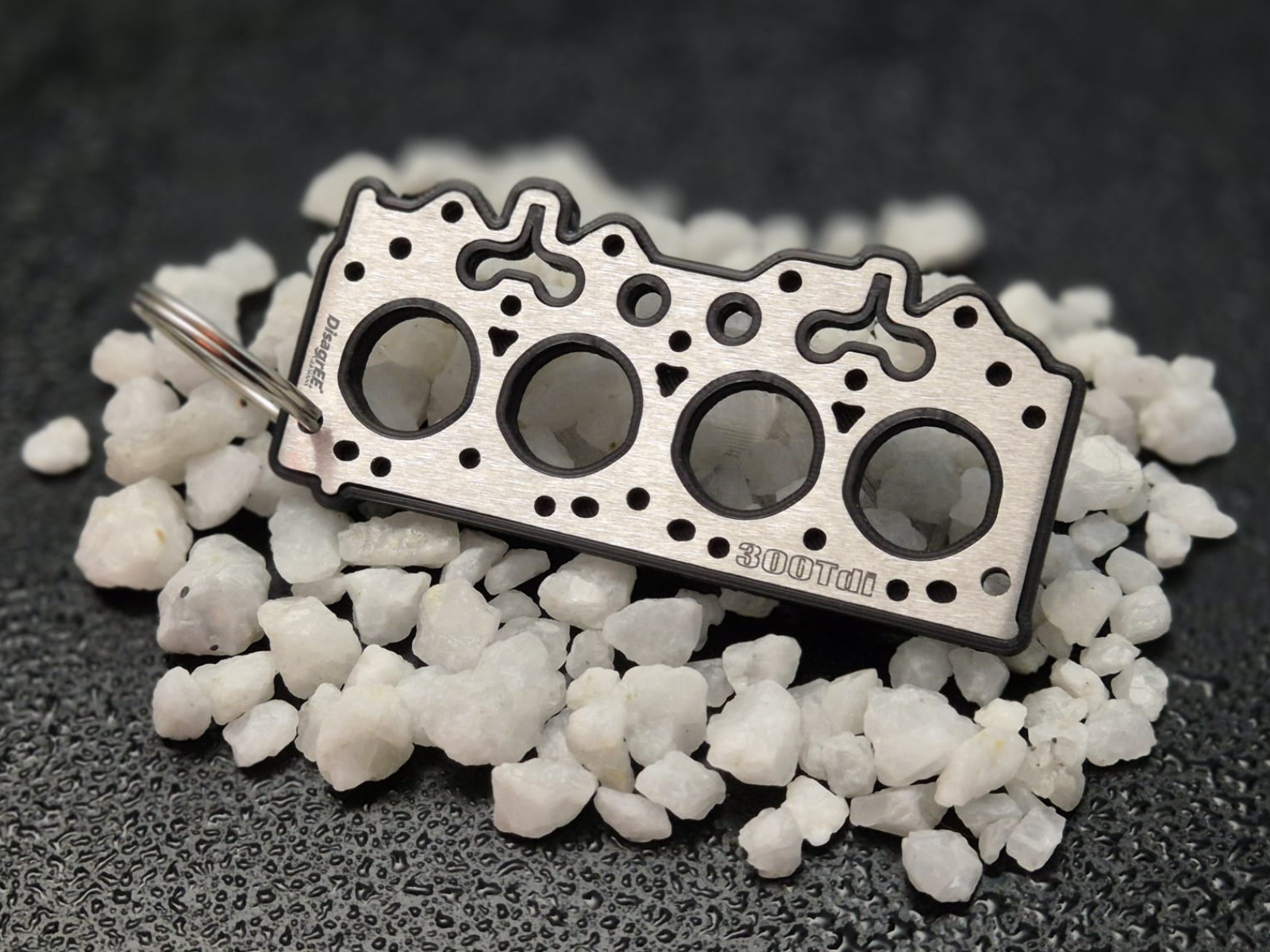 Nicht nur "eine Kopfdichtung als Schlüsselanhänger", sondern exakt jene für den 300Tdi Motor mit allen Details, die in der Größe 62 × 28 × 2 mm möglich sind.