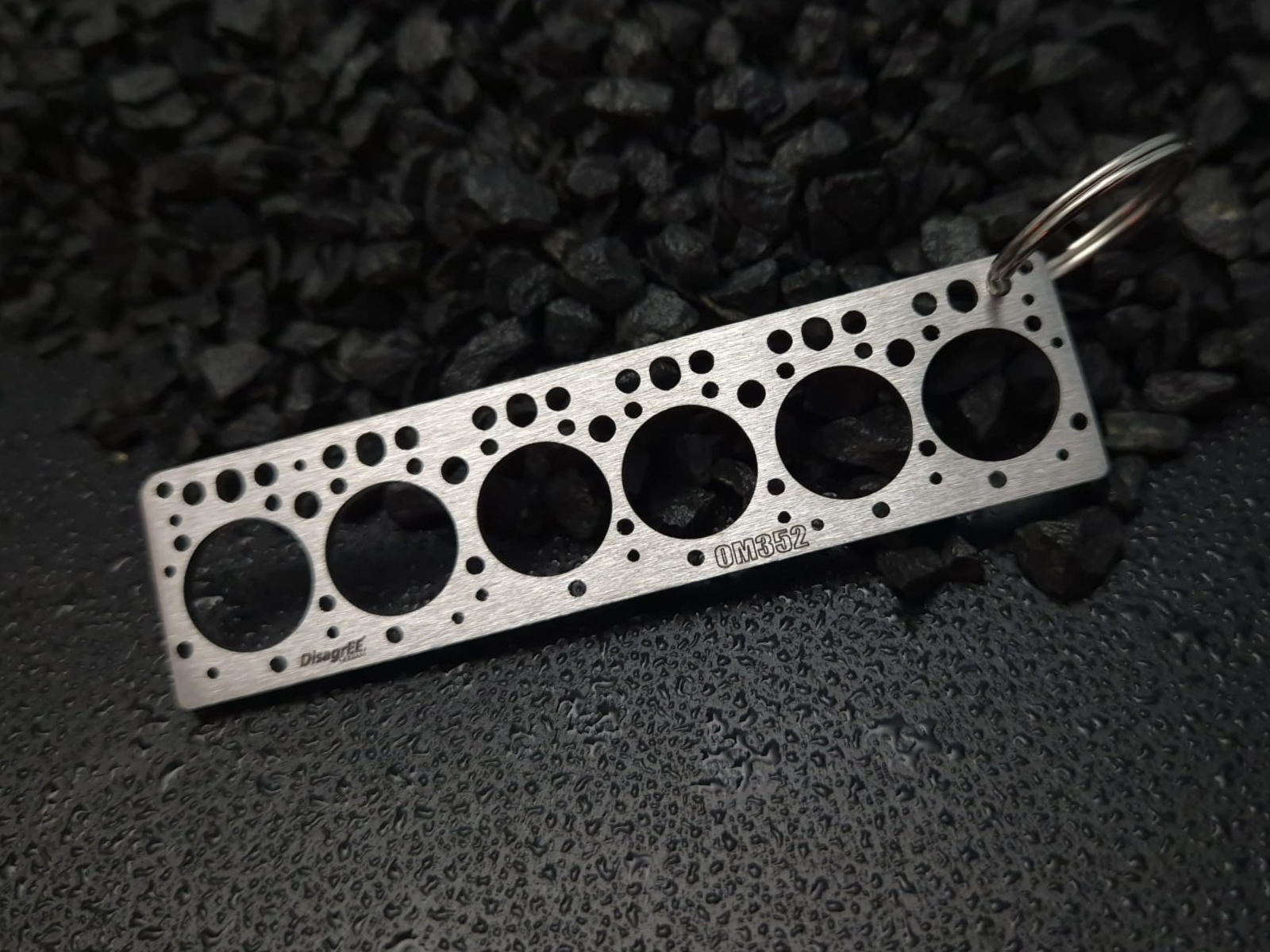 Not just "a head gasket as a keychain", but exactly the one for the OM 352 engine with all the details possible in 80 × 20 × 2 mm size.