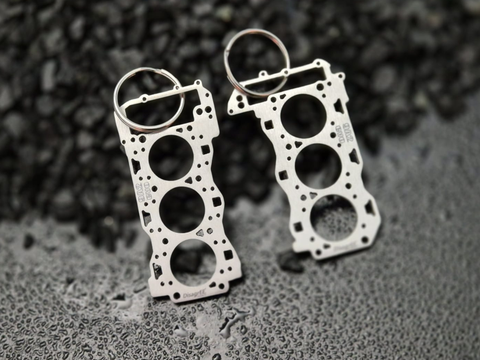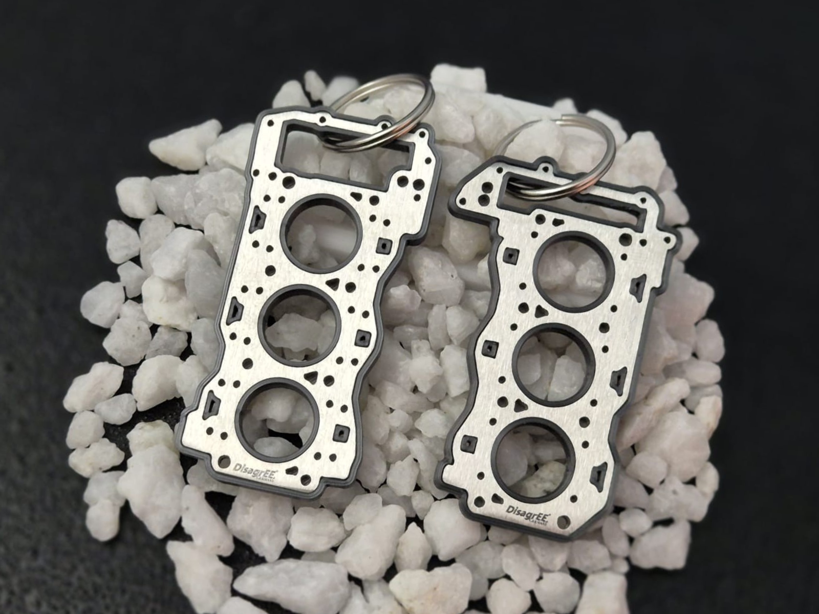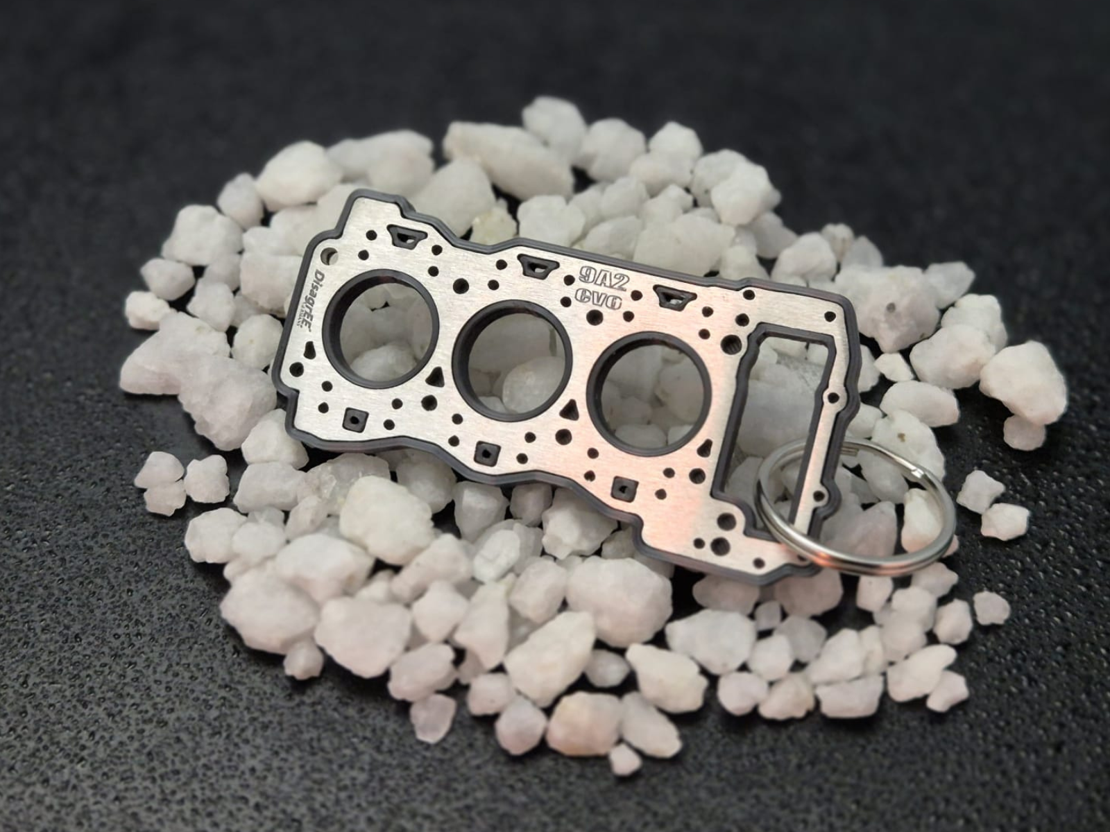 Not just "a head gasket as a keychain", but exactly the one for the 9A2evo engine with all the details possible in L: 59 × 28 × 2 mm - R: 55 × 34 × 2 mm size.