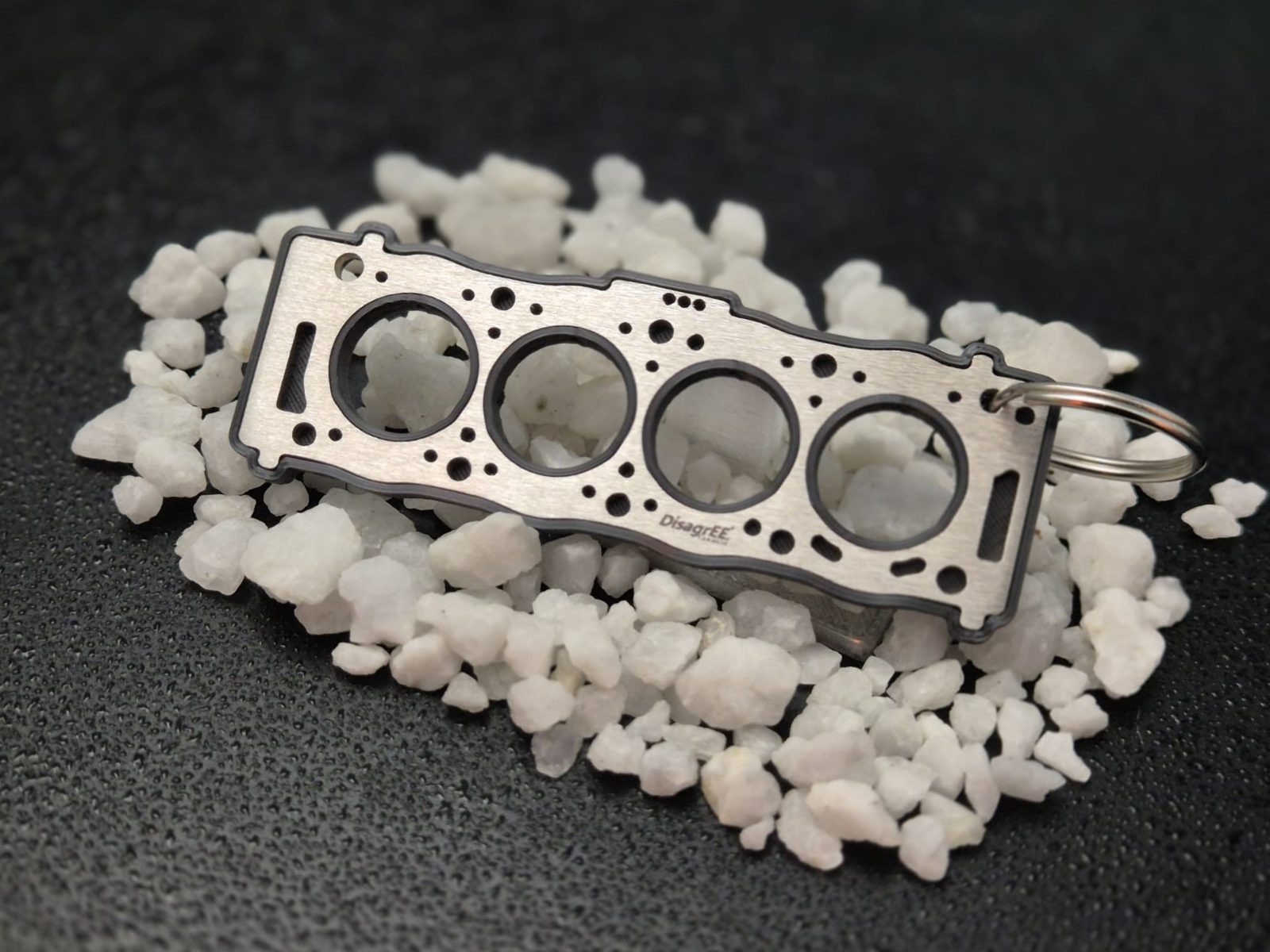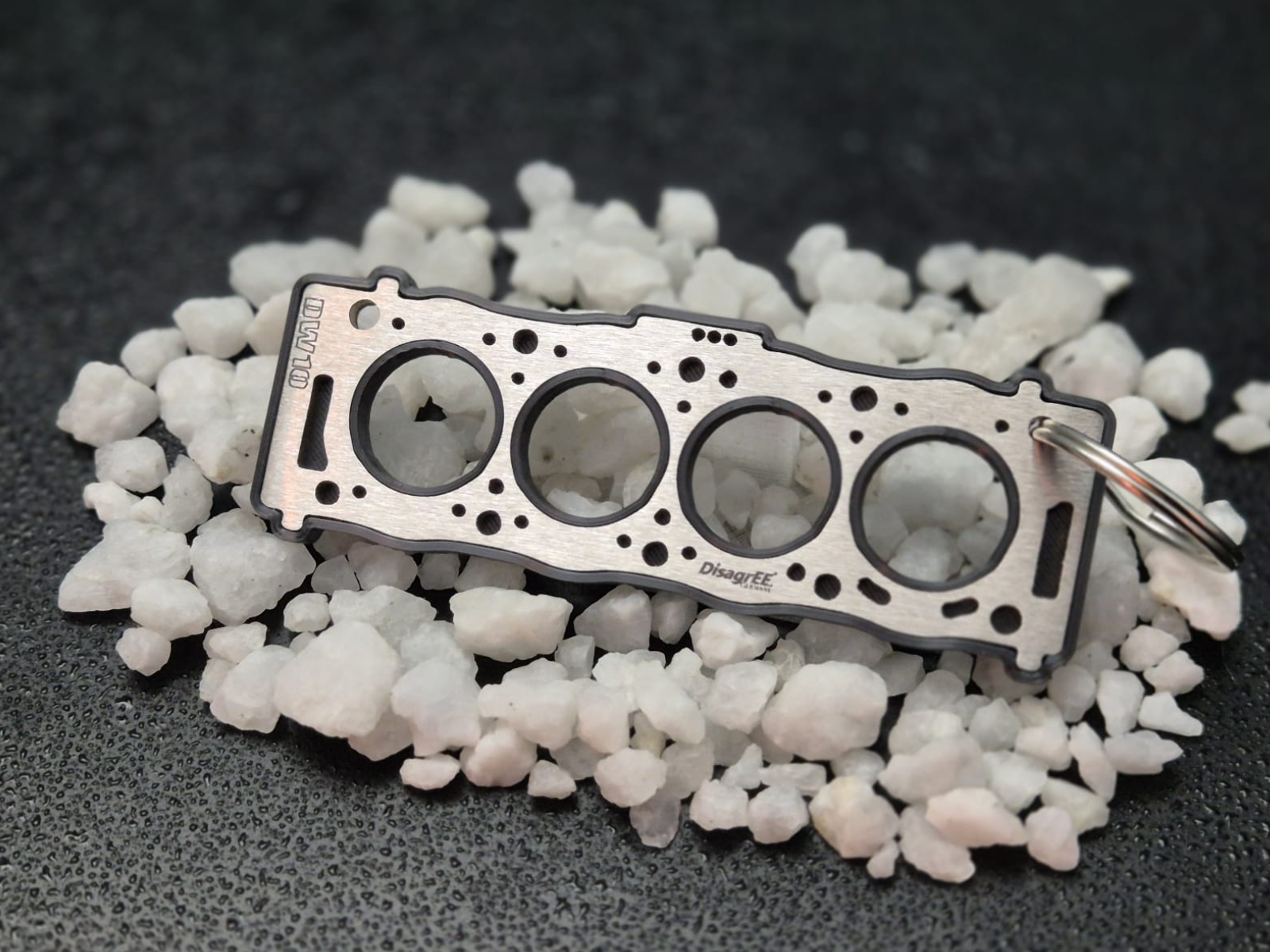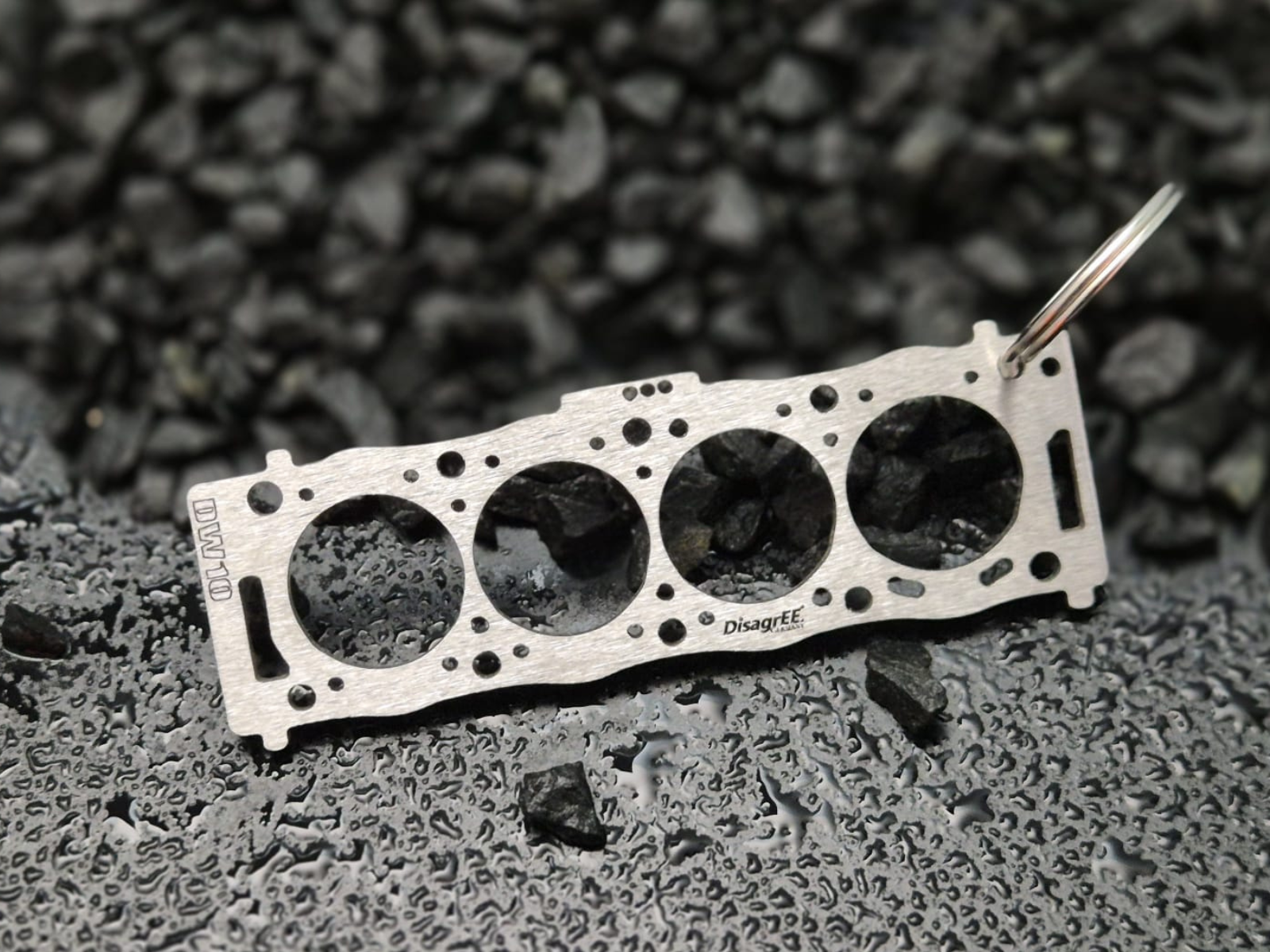 Not just "a head gasket as a keychain", but exactly the one for the DW10 engine with all the details possible in 71 × 24 × 2 mm size.