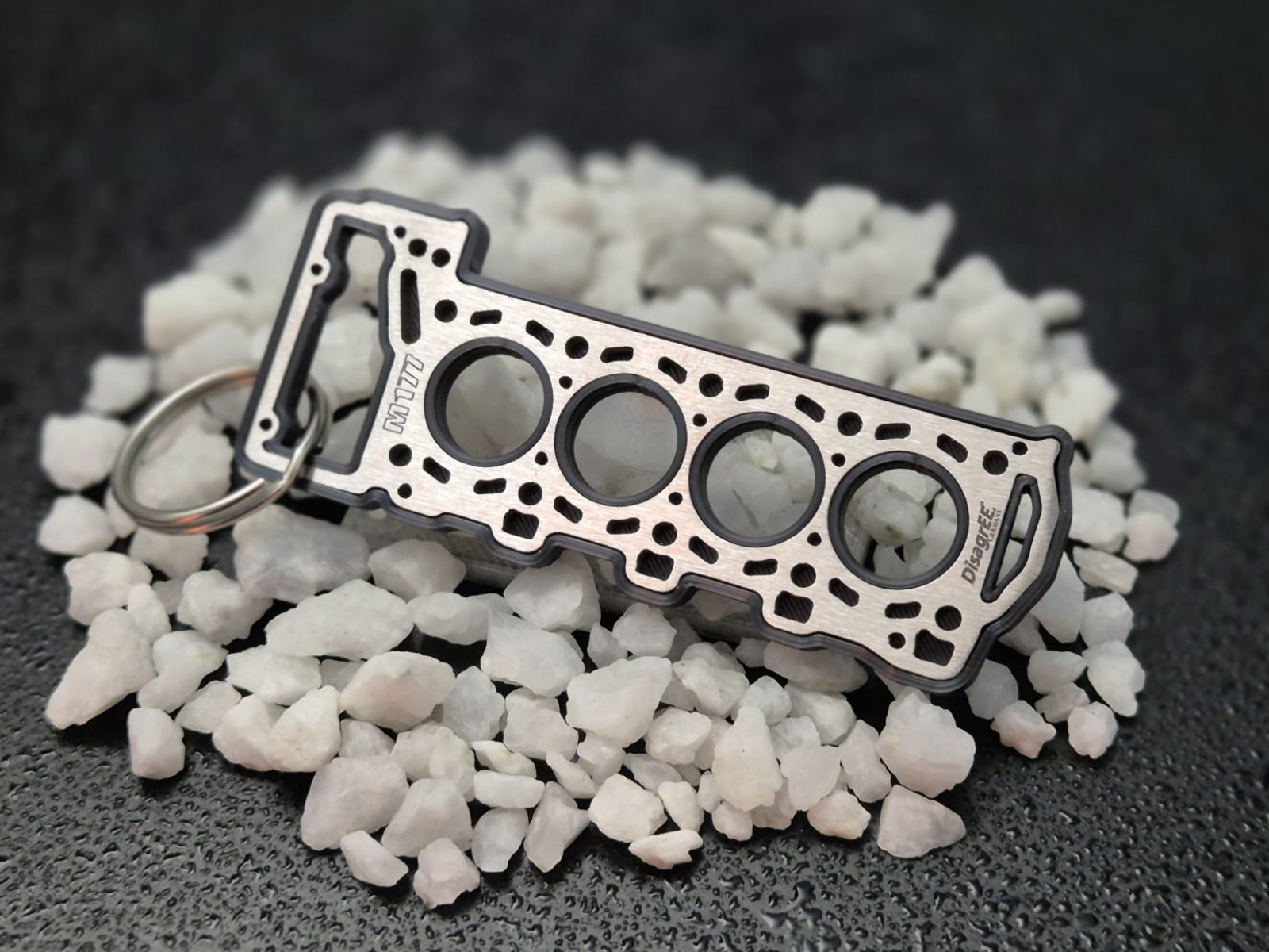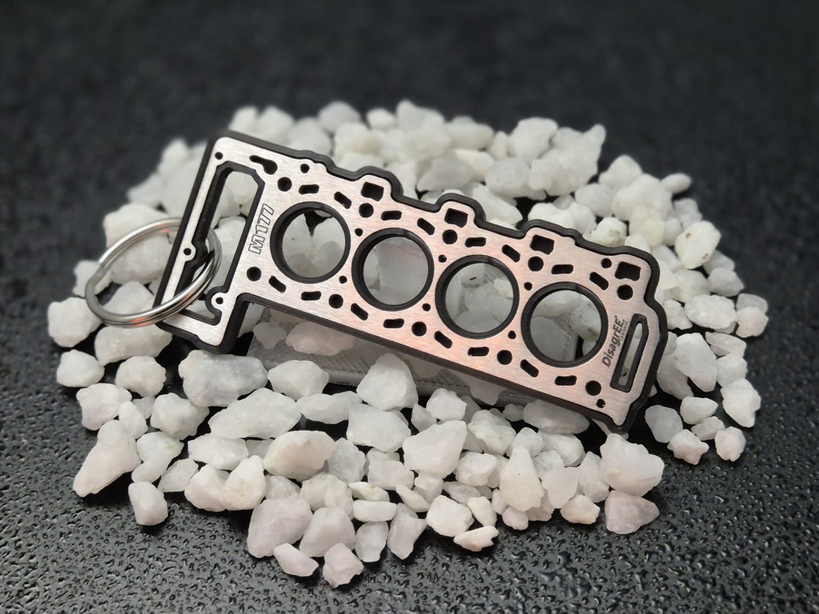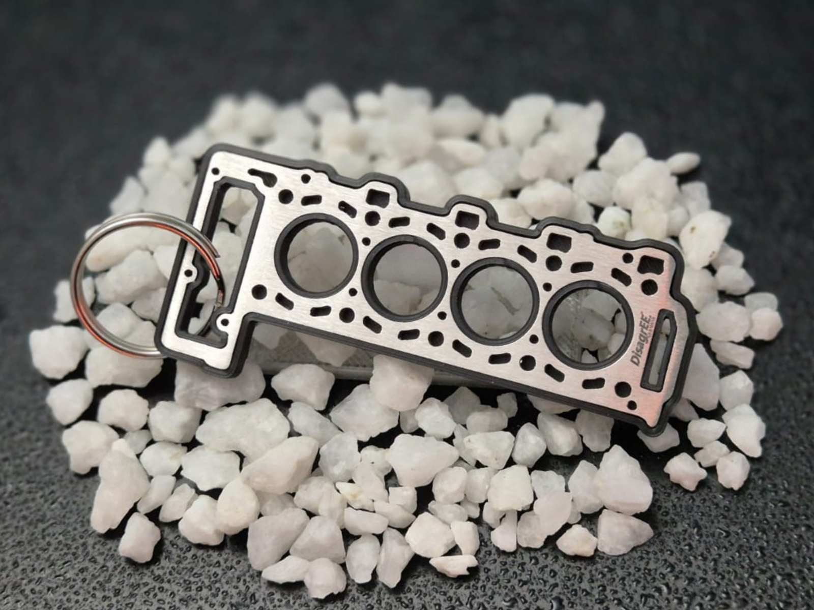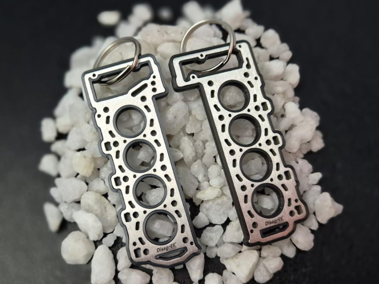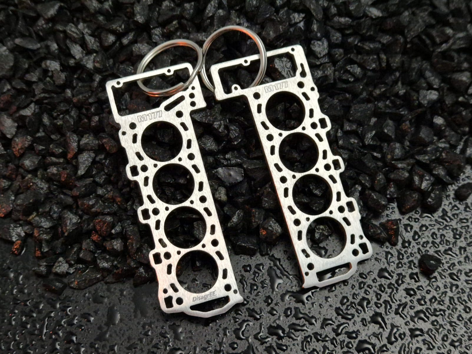 Not just "a head gasket as a keychain", but exactly the one for the M 177 engine with all the details possible in L:68 × 26 × 2 mm - R: 66 × 29 × 2 mm size.