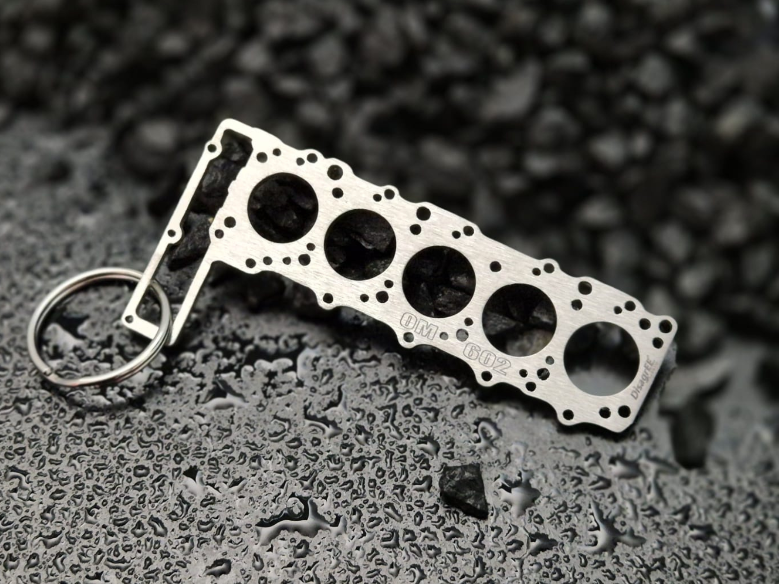 Not just "a head gasket as a keychain", but exactly the one for the OM 602 engine with all the details possible in 0.2*6.8*3.3cm size.