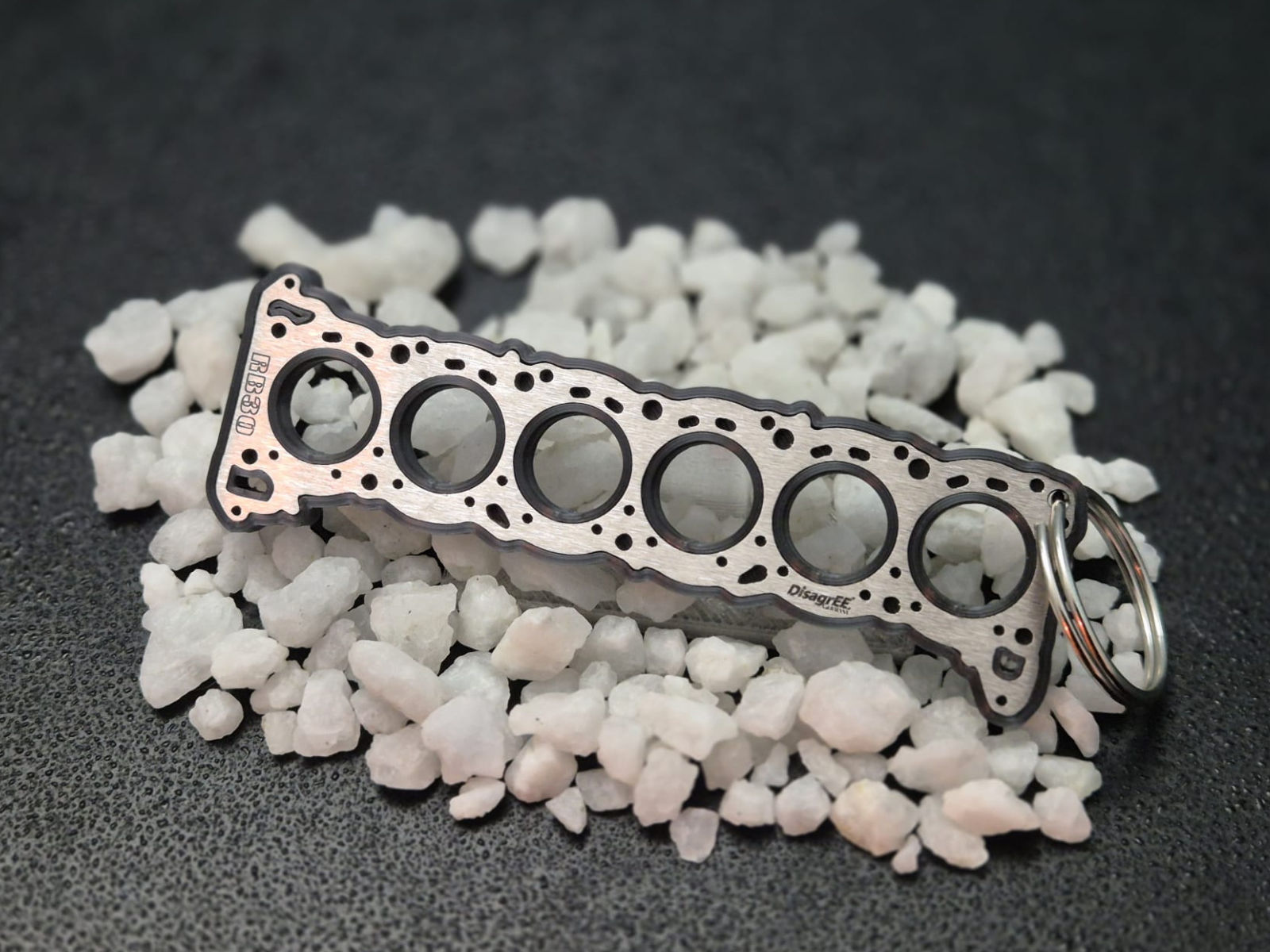 Not just "a head gasket as a keychain", but exactly the one for the RB engine with all the details possible in 0,2 x 7,8 x 2,4cm size.