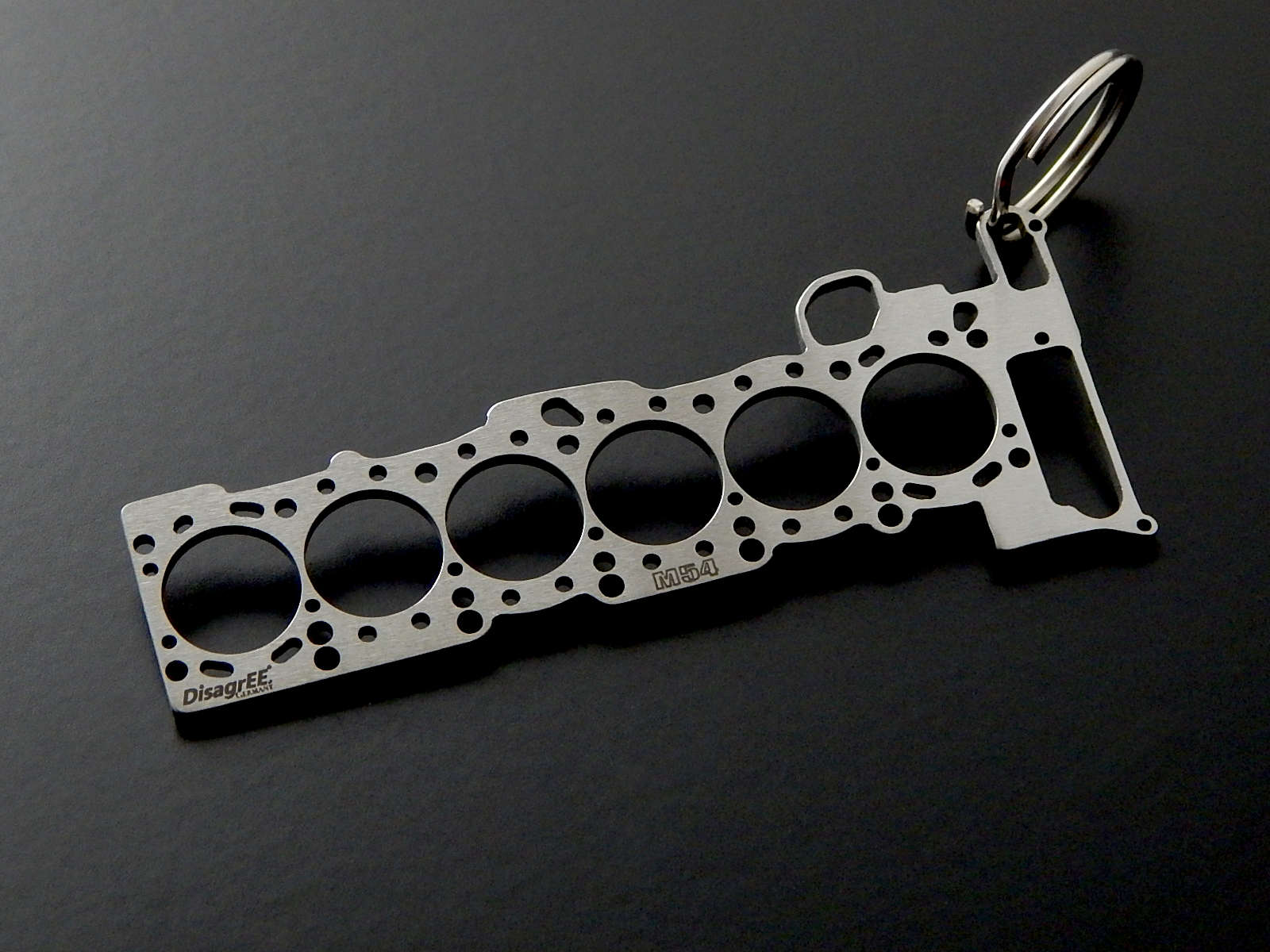 Not just "a head gasket as a keychain", but exactly the one for the M54 engine with all the details possible in 0.2 x 3.2 x 8.0cm size.