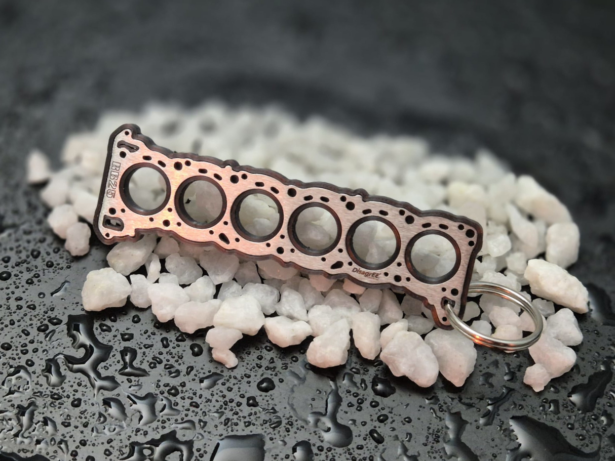 Not just "a head gasket as a keychain", but exactly the one for the RB engine with all the details possible in 0.2 x 7.8 x 2.4cm size.